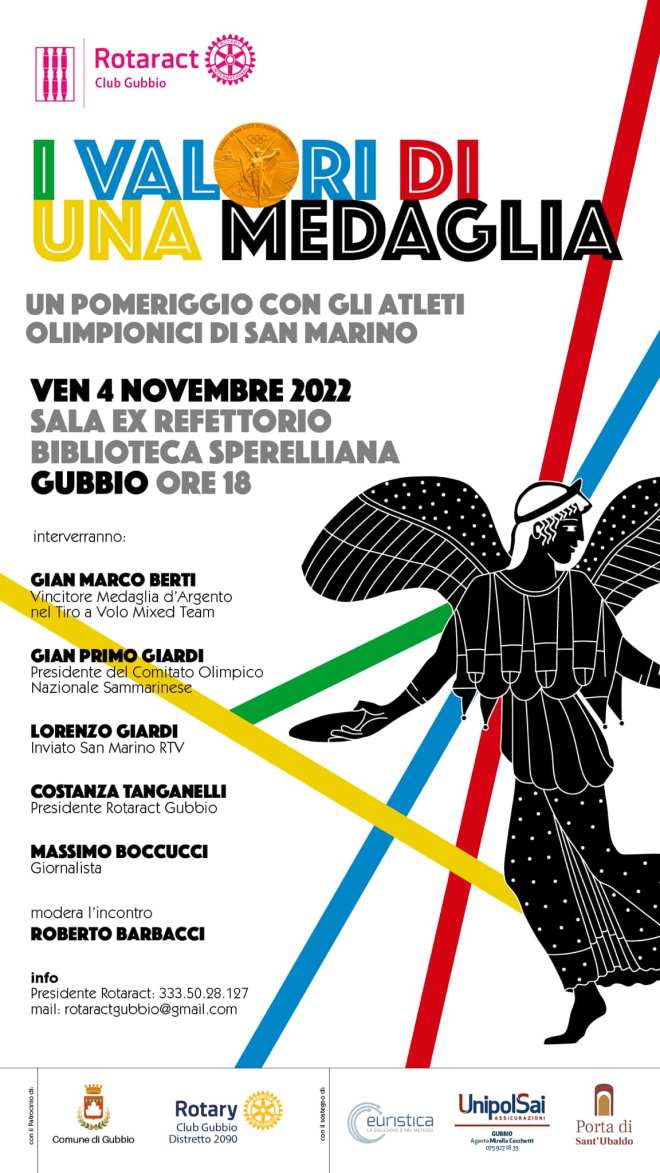 Il Rotaract Club Gubbio ha organizzato per venerdì 4 novembre 2022 alle ore 18 presso la sala Ex Refettorio della Biblioteca Sperelliana, in via Fonte Avellana, l’incontro pubblico su “I valori di una Medaglia: un pomeriggio con gli atleti Olimpionici di San Marino”.