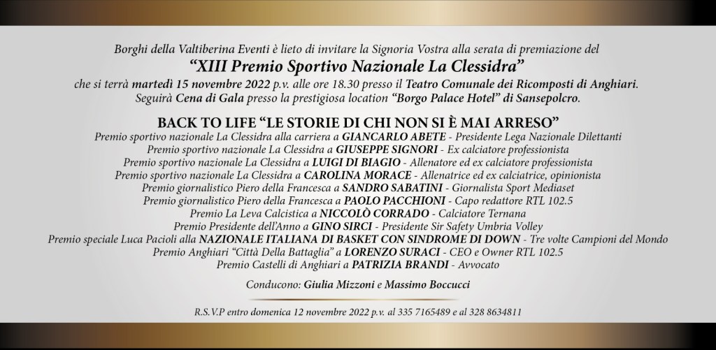 Premio Sportivo Nazionale La Clessidra – 15 novembre 2022 Postato il 7 novembre 20227 novembre 2022 di Massimo Boccucci Ecco svelati gli ospiti premiati della “XIII Edizione”. Fonte video: pagina facebook “Premio Sportivo Nazionale La Clessidra“. Condividi: Condividi su X (Si apre in una nuova finestra) X Condividi su Facebook (Si apre in una nuova finestra) Facebook Mi piace Caricamento... Correlati