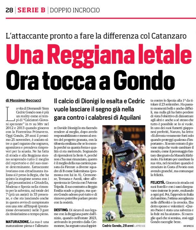 La vita di Diomandè Yann Cedric Gondo non è più un reality come ai tempi di “Calciatori-Giovani speranze” in tv su Mtv nel 2012 e 2013 quando giocava con la Fiorentina Primavera. Oggi Gondo, 29 anni il prossimo 25 novembre, è andato oltre a quel ragazzo che sognava, sgomitava e prendeva rimproveri per la scuola. Ne ha fatta di strada e alla Reggiana stanno scoprendo tutto il meglio del repertorio e del suo essere determinante. L’attaccante ivoriano con cittadinanza italiana si è preso la Regia, che ha spinto la stagione scorsa con i 3 gol pesantissimi a Cittadella, Modena e Spezia nella rimonta per la salvezza, sul totale dei 7 (più un assist) in 33 presenze, e che sta lanciando anche in questo avvio di campionato con una rete all’Empoli (prestazione devastante) nelle 3 gare da titolarissimo a tempo pieno.
