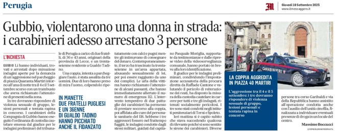 In tre dovranno rispondere di violenza sessuale di gruppo, lesioni personali e tentata rapina in concorso. I carabinieri della Compagnia di Gubbio hanno eseguito l’ordinanza di custodia cautelare emessa dal giudice per le indagini preliminari del tribunale di Perugia a carico di due fratelli, di 36 e 43 anni, originari della provincia di Lecce, e un trentaseienne residente a Gualdo Tadino.