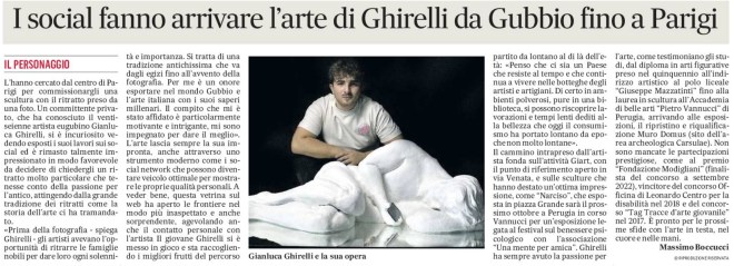 «Prima della fotografia – spiega Ghirelli – gli artisti avevano l’opportunità di ritrarre le famiglie nobili per dare loro ogni solennità e importanza. Si tratta di una tradizione antichissima che va dagli egizi fino all’avvento della fotografia. Per me è un onore esportare nel mondo Gubbio e l’arte italiana con i suoi saperi millenari. Il compito che mi è stato affidato è particolarmente motivante e intrigante, mi sono impegnato per dare il meglio». L’arte lascia sempre la sua impronta, anche attraverso uno strumento moderno come i social network che possono diventare veicolo ottimale per mostrare le proprie qualità personali. A veder bene, questa vetrina sul web ha aperto le frontiere nel modo più inaspettato e anche sorprendente, agevolando anche il contatto personale con l’artista. Il giovane Ghirelli si è messo in gioco e sta raccogliendo i migliori frutti del percorso partito da lontano al di là dell’età: «Penso che ci sia un Paese che resiste al tempo e che continua a vivere nelle botteghe degli artisti e artigiani. Di certo in ambienti polverosi, pure in una biblioteca, si possono riscoprire lavorazioni e tempi lenti dediti alla bellezza che oggi il consumismo ha portato lontano da epoche non molto lontane».