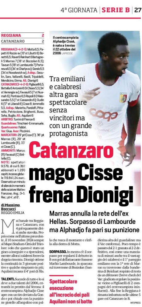 CATANZARO (3-4-2-1): Pigliacelli 6,5; Bettella 6 Antonini 6 Di Chiara 5,5 (34’ st Verrengia sv); Favasuli 5 (1’ st Nuamah 6), Pontisso 6,5 Rispoli 6 D’Alessandro 5,5 (1’ st Cassandro 6); Oudin 6 (17’ st Liberali 6) Cisse 8; Iemmello 5,5. A disp.: Marietta, Pandolfi, Pittarello, Petriccione, Brighenti, Buso, Seha, Buglio. All.: Aquilani 6