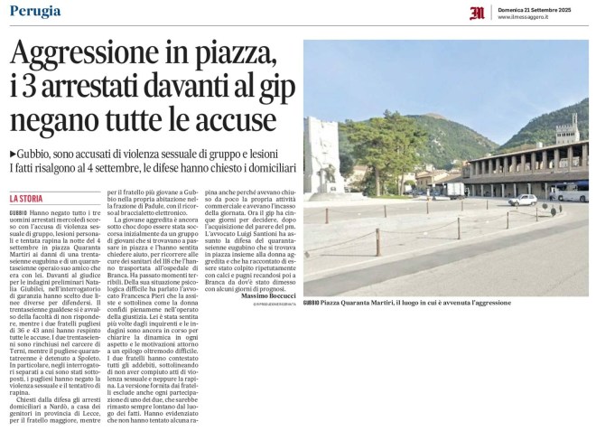 La giovane aggredita è ancora sotto choc dopo essere stata soccorsa inizialmente da un gruppo di giovani che si trovavano a passare casualmente in piazza e l’hanno sentita chiedere aiuto, per ricorrere alle cure dei sanitari del 118 che quella notte dai sanitari l’hanno trasportata all’ospedale di Branca. Ha passato momenti terribili ed è rimasta traumatizzata e spaventata. Della sua situazione psicologica difficile ha parlato l’avvocato Francesca Pieri che la difende e sottolinea come la sia assistita confidi pienamene nell’operato della giustizia dopo l’intervento dei carabinieri. La donna è stata sentita più volte dagli inquirenti e le indagini sono ancora in corso per chiarire la dinamica in ogni aspetto e le motivazioni attorno a un epilogo oltremodo difficile. I due fratelli hanno contestato tutti gli addebiti, sottolineando di non aver compiuto atti di violenza sessuale e neppure la rapina. La versione fornita dai fratelli esclude anche ogni partecipazione di uno dei due, che sarebbe rimasto sempre lontano dal luogo dei fatti. Hanno evidenziato che non hanno tentato alcuna rapina anche perché avevano chiuso da poco la propria attività commerciale e avevano l’incasso della giornata. Ora il gip ha cinque giorni di tempo per decidere, dopo l’acquisizione del parere del pubblico ministero Laura Reale. L’avvocato Luigi Santioni ha assunto la difesa del quarantaseienne eugubino che si trovava in piazza insieme alla donna aggredita e che ha raccontato di essere stato colpito ripetutamente con calci e pugni recandosi a Branca da dov’è stato dimesso con alcuni giorni di prognosi.