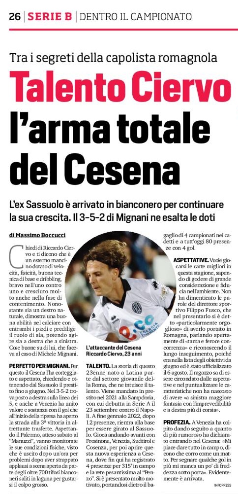 Chiedi di Riccardo Ciervo e ti dicono che è un esterno mancino dotato di velocità, fisicità, buona tecnica di base e dribbling, bravo nell’uno contro uno e cresciuto molto anche nella fase di contenimento. Nonostante sia un destro naturale, dimostra una buona abilità nel calciare con entrambi i piedi e predilige il ruolo di ala, potendo agire sia a destra che a sinistra. Cose buone su di lui, che faceva al caso di Michele Mignani.
