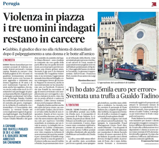 Al giudice hanno parlato anche del ruolo del terzo uomo, un cuoco di Gualdo Tadino, che si è invece avvalso della facoltà di non rispondere. Stando al loro racconto, lui avrebbe discusso con l’operaio che stava insieme alla donna, ma solo per equivoco: l’avrebbe scambiato, in sostanza, per un rivale in amore. Le indagini dei carabinieri di Gubbio continuano, l’avvocato Ubaldo Minelli dopo aver visto respinta la richiesta di scarcerazione dei suoi due assistiti per i domiciliari il fratello maggiore a Nardò a casa dei genitori e il minore nella sua casa di Gubbio a Padule, ha preannunciato ricorso al tribunale della libertà. I due arrestati più giovani sono rinchiusi nel carcere di Terni, mentre il quarantatreenne pugliese si trova nell’istituto penitenziario di Spoleto. I due aggrediti hanno ricostruito l’accaduto. La giovane è rappresentata dall’avvocato Francesca Pieri, mentre il suo amico da Luigi Santioni.