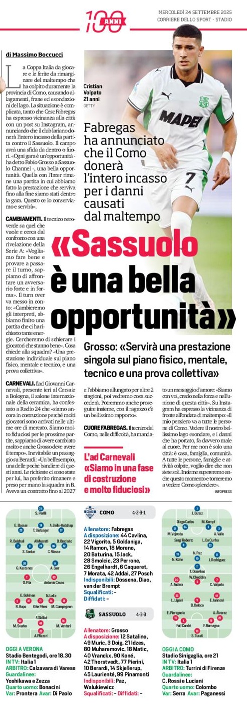 La Coppa Italia da giocare e le ferite da rimarginare del maltempo che ha colpito duramente la provincia di Como, causando allagamenti, frane ed esondazioni del lago. La situazione è complicata, tanto che Cesc Fabregas ha espresso vicinanza alla città con un post su Instagram, annunciando che il club lariano donerà l’intero incasso della partita contro il Sassuolo. Il campo avrà una sfida da dentro o fuori. «Ogni gara è un’opportunità – ha detto Fabio Grosso a Sassuolo Channel -, una bella opportunità. Quella con l’Inter rimane una partita in cui abbiamo fatto la prestazione che serviva fino alla fine siamo stati dentro la gara. Questo ce lo conserviamo e servirà».