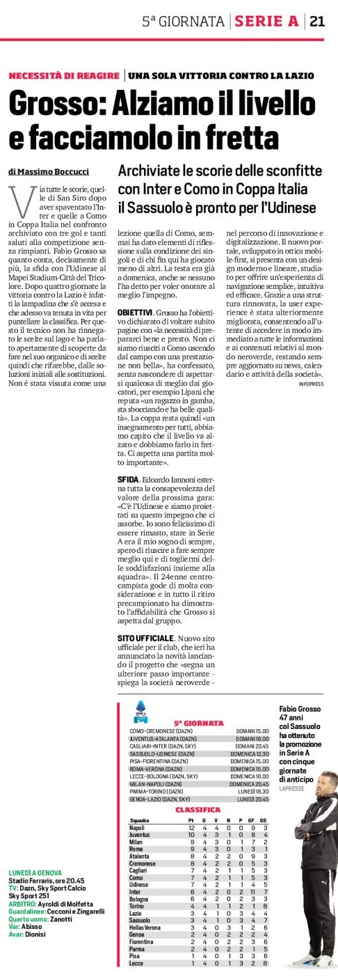 Via tutte le scorie, quelle di San Siro dopo aver spaventato l’Inter e quelle a Como in Coppa Italia nel confronto archiviato con tre gol e tanti saluti alla competizione senza rimpianti. Fabio Grosso sa quanto conta, decisamente di più, la sfida con l’Udinese al Mapei Stadium-Città del Tricolore. Dopo quattro giornate la vittoria contro la Lazio è infatti la lampadina che s’è accesa e che adesso va tenuta in vita per puntellare la classifica. Per questo il tecnico non ha rinnegato le scelte sul lago e ha parlato apertamente di scoperte da fare nel suo organico e di scelte quindi che rifarebbe, dalle soluzioni iniziali alle sostituzioni. Non è stata vissuta come una lezione quella di Como, semmai ha dato elementi di riflessione sulla condizione dei singoli e di chi fin qui ha giocato meno di altri. La testa era già a domenica, anche se nessuno l’ha detto per voler onorare al meglio l’impegno.