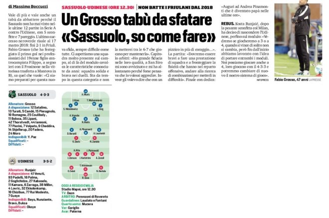 Vale di più e vale anche un tabù da abbattere perché il Sassuolo non ha mai vinto nelle ultime 12 partite in Serie A contro l’Udinese, con 5 sconfitte e 7 pareggio. L’ultimo successo neroverde risale al 17 marzo 2018: finì 2-1 in Friuli. Fabio Grosso (che ha festeggiato il primo gol nei professionisti del 19enne figlio centrocampista Filippo, a segno ieri con il Frosinone nella vittoriosa trasferta a Mantova in B), sa quel che vuole: «Ci siamo preparati per questa nuova sfida, sempre difficile come tutte. Ci aspettiamo una squadra molto presente sul campo, al di là del modulo cavalca le caratteristiche conosciute da anni: squadra solida e brava nei duelli. Sta da tempo in questa categoria e non la metterei tra le 6-7 che giocano per mantenerla». Capitolo arbitri: «Ho grande fiducia nelle loro qualità, a San Siro mi sono avvicinato e mi ha allontanato perché forse pensava che lo volessi aggredire. Invece gli volevo dire che con un pizzico in più di coraggio…». La partita: «Dovremo essere bravi a fare una prestazione di squadra e a fronteggiare la fisicità che hanno nel reparto offensivo, andare alla ricerca di combinazioni per metterli in difficoltà». Finale con dedica: «Auguri ad Andrea Pinamonti che è diventato papà nelle ultime ore».
