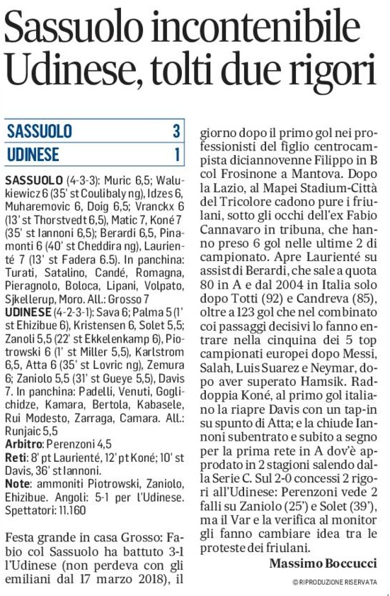 Festa grande in casa Grosso: Fabio col Sassuolo ha battuto 3-1 l’Udinese (non perdeva con gli emiliani dal 17 marzo 2018), il giorno dopo il primo gol nei professionisti del figlio centrocampista diciannovenne Filippo in B col Frosinone a Mantova. Dopo la Lazio, al Mapei Stadium-Città del Tricolore cadono pure i friulani, sotto gli occhi dell’ex Fabio Cannavaro in tribuna, che hanno preso 6 gol nelle ultime 2 di campionato. Apre Laurienté su assist di Berardi, che sale a quota 80 in A e dal 2004 in Italia solo dopo Totti (92) e Candreva (85), oltre a 123 gol che nel combinato coi passaggi decisivi lo fanno entrare nella cinquina dei 5 top campionati europei dopo Messi, Salah, Luis Suarez e Neymar, dopo aver superato Hamsik. Raddoppia Koné, al primo gol italiano la riapre Davis con un tap-in su spunto di Atta; e la chiude Iannoni subentrato e subito a segno per la prima rete in A dov’è approdato in 2 stagioni salendo dalla Serie C. Sul 2-0 concessi 2 rigori all’Udinese: Perenzoni vede 2 falli su Zaniolo (25’) e Solet (39’), ma il Var e la verifica al monitor gli fanno cambiare idea tra le proteste dei friulani.