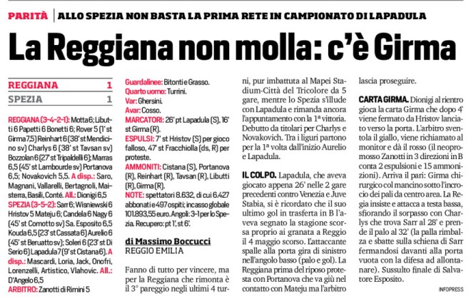 Fanno di tutto per vincere, ma per la Reggiana che rimonta è il 3° pareggio negli ultimi 4 turni, pur imbattuta al Mapei Stadium-Città del Tricolore da 5 gare, mentre lo Spezia s’illude con Lapadula e rimanda ancora l’appuntamento con la 1ª vittoria. Debutto da titolari per Charlys e Novakovich. Tra i liguri partono per la 1ª volta dall’inizio Aurelio e Lapadula.