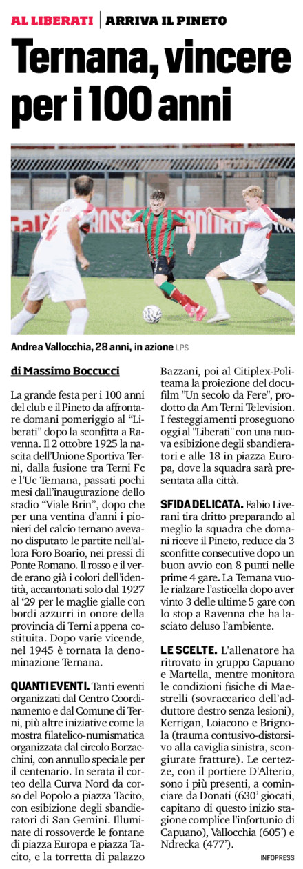 La grande festa per i 100 anni del club e il Pineto da affrontare domani pomeriggio al “Liberati” dopo la sconfitta a Ravenna. Il 2 ottobre 1925 la nascita dell’Unione Sportiva Terni, dalla fusione tra Terni Fc e l’Uc Ternana, passati pochi mesi dall’inaugurazione dello stadio “Viale Brin”, dopo che per una ventina d’anni i pionieri del calcio ternano avevano disputato le partite nell’allora Foro Boario, nei pressi di Ponte Romano. Il rosso e il verde erano già i colori dell’identità, accantonati solo dal 1927 al ‘29 per le maglie gialle con bordi azzurri in onore della provincia di Terni appena costituita. Dopo varie vicende, nel 1945 è tornata la denominazione Ternana.