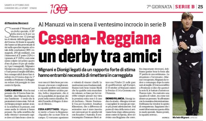 Si accende il “Manuzzi” per un derby speciale, il 20° della storia in B per un bilancio con 12 pareggi tra 4 vittorie della Reggiana e 3 del Cesena. Di fronte le squadre che hanno un’alta percentuale di tiri nello specchio rispetto al totale delle conclusioni (309 i romagnoli, 293 gli emiliani), coi bianconeri al 2° posto (52%) e i granata al 3° (50%), così come sanno colpire nel 1° quarto d’ora di gioco (6 per gli emiliani, 5 per i romagnoli). Ci sarà un gran bel pubblico e il peso del risultato si farà sentire. Michele Mignani e Davide Dionigi sono amici, si rispettano e l’uno pensa il meglio dell’altro, ben consapevoli di dover fare risultato tra il Cesena dopo la 1ª sconfitta a Frosinone e la Reggiana reduce dal pareggio in casa contro lo Spezia.