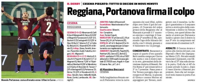 Nella lunghissima sfrenata corsa di Portanova verso la curva opposta dai suoi tifosi, subito dopo aver fatto il gol del sorpasso, c’è l’essenza del colpo grosso della Reggiana che al Manuzzi si prende il 1° successo esterno e costringe il Cesena alla 2ª sconfitta di fila, spostando l’ago della bilancia dei derby, con 5 vittorie granata e 4 bianconere tra 12 pareggi.