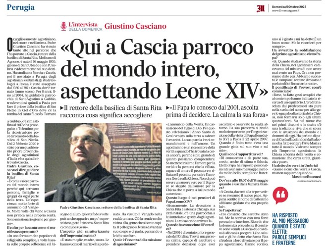 «Ero convinto che sarebbe stato lui. Me lo sentivo con una forte percezione interiore. Ricordo che la domenica precedente il conclave sono venuti a Cascia due cardinali africani a pregare. Li ho salutati e gli ho detto che Santa Rita chiedeva a loro di votare per il papa agostiniano. Hanno sorriso, uno si è girato e mi ha detto: È un buon nome. Me lo ricorderò per sempre».