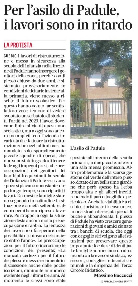 GUBBIO I lavori di ristrutturazione e messa in sicurezza alla scuola dell’infanzia nella frazione di Padule fanno insorgere i genitori della zona, perché con il plesso chiuso da due anni, e sistemato provvisoriamente in condizioni deficitarie insieme alla primaria, viene messo a rischio il futuro scolastico. Per questo hanno voluto far sentire la loro voce: temono di vedere svuotato un serbatoio di studenti. Partiti nel 2023, i lavori dovevano finire al via di quest’anno scolastico, ma a oggi sono ancora incompleti, con l’azienda incaricata di effettuare la ristrutturazione che negli ultimi mesi ha mandato solo sporadicamente piccole squadre di operai, che non sono state in grado di tenere fede agli impegni presi. «Le preoccupazioni dei genitori dei bambini frequentanti la scuola dell’infanzia di Padule – scrivono – poco si placano nonostante, dopo lungo tempo, sono ripartiti i lavori. Da mesi le famiglie stanno seguendo in solitudine la situazione e a metà settembre alcuni operai hanno ripreso a lavorare. Purtroppo, a oggi la situazione desta ancora molta preoccupazione e rabbia. La lentezza dei lavori non fa sperare nella possibilità di chiusura del cantiere entro l’anno». Le preoccupazioni per il futuro incrociano le condizioni del presente: «La mancata certezza per il futuro del plesso è messa seriamente in discussione anche dalle poche iscrizioni, diminuite in numero evidente negli ultimi tre anni. Al momento le classi sono state spostate all’interno della scuola primaria, in due piccole aule e in una sala mensa promiscua. Altra problematica è la scarsa gestione del verde dell’intero plesso, dotato di un bellissimo giardino che però spesso ha l’erba troppo alta e gli alberi incolti, rendendo il parco inagibile e pericoloso. Anche la viabilità è a rischio, ripristinato il senso unico, in una strada dissestata piena di buche e abbandonata. Il plesso di Padule ha visto crescere generazioni di giovani e amicizie nate tra i banchi di scuola, che oggi con orgoglio si rivolgono alle istituzioni per preservare questo importante focolare d’identità». Le famiglie annunciano un altro incontro a breve con sindaco, assessori, consiglieri e tecnici comunali e la dirigenza del Terzo Circolo Didattico.