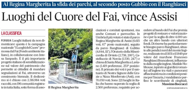 PERUGIA Luoghi italiani da non dimenticare: questa è la campagna nazionale “I Luoghi del Cuore” promossa dal Fai (Fondo ambiente italiano), in collaborazione con Intesa Sanpaolo. È il più importante progetto italiano di sensibilizzazione sul valore del patrimonio che permette ai cittadini di mandare segnalazioni al Fai, attraverso un censimento biennale. Il dodicesimo si è chiuso con 2.316.984 voti raccolti, con 196 comunità registrate in tutta Italia, sotto forma di associazioni e comitati spontanei, ma anche Comuni e parrocchie. In Umbria il più votato è stato il parco Regina Margherita di Assisi (6.615 voti, 67° posto nazionale), seguito da parco Ranghiasci di Gubbio (4.844, 111°), l’Oratorio della Misericordia di Orvieto (2.738, 200°), Castelluccio di Norcia (1.530, 247°) e chiesa di Santa Margherita a Laviano (1.419 preferenze, 253ª posizione). Il primato dei voti è per il santuario di Nostra Signore delle Grazie a Nizza Monferrato (Asti), con 70.050 voti. Sono 221 luoghi in Italia che hanno superato la soglia di 2.500 preferenze, requisito per accedere al bando del Fai che premia progetti di restauro e valorizzazione e per la soglia di oltre 4.000 anche un altro bando con ulteriori fondi. Di risorse ha particolarmente bisogno parco Ranghiasci, situato alle pendici nord del monte Ingino, realizzato tra il 1831 e il 1849 per volere del marchese Francesco Ranghiasci Brancaleoni, influenzato dalla moglie inglese, Matilde Hobhouse, ispirato ai giardini romantici all’inglese tra viali e panorami affascinanti ma in condizioni pessime per l’incuria, i vandalismi e perfino le scorribande di cinghiali.