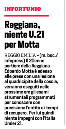 REGGIO EMILIA – (m. boc./infopress) Il 20enne portiere della Reggiana Edoardo Motta è adesso alle prese con una lesione al quadricipite della coscia, verranno eseguiti nelle prossime ore gli esami strumentali programmati per conoscere con precisione l’entità e i tempi di recupero. Per lui quindi niente impegni con l’Italia Under 21.