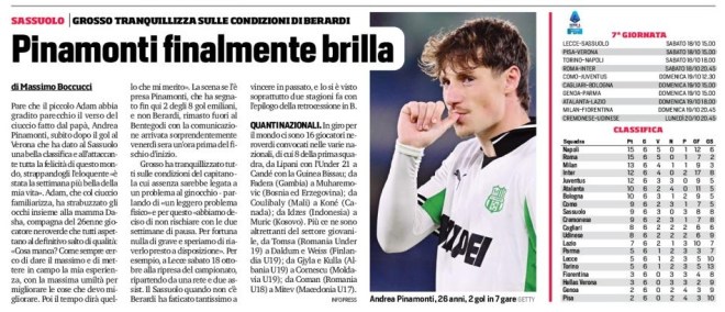 Pare che il piccolo Adam abbia gradito parecchio il verso del ciuccio fatto dal papà, Andrea Pinamonti, subito dopo il gol al Verona che ha dato al Sassuolo una bella classifica e all’attaccante tutta la felicità di questo mondo, strappandogli l’eloquente «è stata la settimana più bella della mia vita». Adam, che col ciuccio familiarizza, ha strabuzzato gli occhi insieme alla mamma Dasha, compagna del 26enne giocatore neroverde che tutti aspettano al definitivo salto di qualità: «Cosa manca? Come sempre cerco di dare il massimo e di mettere in campo la mia esperienza, con la massima umiltà per migliorare le cose che devo migliorare. Poi il tempo dirà quello che mi merito». La scena se l’è presa Pinamonti, che ha segnato fin qui 2 degli 8 gol emiliani, e non Berardi, rimasto fuori al Bentegodi con la comunicazione arrivata sorprendentemente venerdì sera un’ora prima del fischio d’inizio.