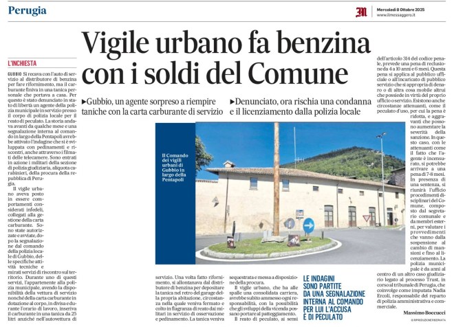 Il vigile urbano aveva posto in essere comportamenti considerati infedeli, collegati alla gestione della carta carburante. Sono state autorizzate e avviate, dopo la segnalazione dal comando della polizia locale di Gubbio, delle specifiche attività tecniche e mirati servizi di riscontro sul territorio. Durante uno di questi servizi, l’appartenente alla polizia municipale, avendo la disponibilità della vettura di servizio nonché della carta carburante in dotazione al corpo, in divisa e durante l’orario di lavoro, inseriva il carburante in una tanica da 25 litri anziché nell’autovettura di servizio. Una volta fatto rifornimento, si allontanava dal distributore di benzina per depositare la tanica nel retro del garage della propria abitazione, circostanza nella quale veniva fermato e colto in flagranza di reato dai militari in servizio di osservazione e pedinamento. La tanica veniva sequestrata e messa a disposizione della procura.