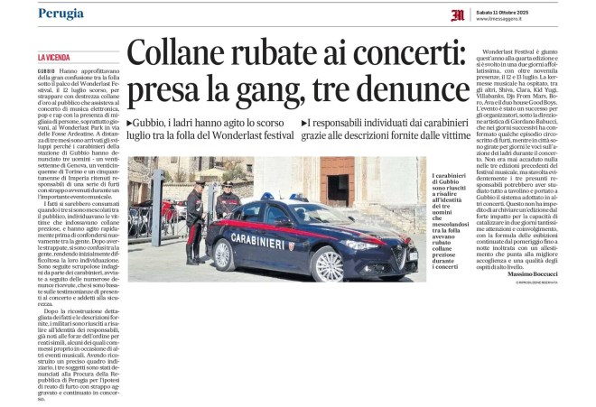 GUBBIO Hanno approfittato della gran confusione tra la folla sotto il palco del Wonderlast Festival, il 12 luglio scorso, per strappare con destrezza collane d’oro al pubblico che assisteva al concerto di musica elettronica, pop e rap con la presenza di migliaia di persone, soprattutto giovani, al Wonderlast Park in via delle Fosse Ardeatine. A distanza di tre mesi sono arrivati gli sviluppi perché i carabinieri della Stazione di Gubbio hanno denunciato in stato di libertà tre uomini – un ventisettenne di Genova, un venticinquenne di Torino e un cinquantunenne di Imperia – ritenuti responsabili di una serie di furti con strappo avvenuti durante un l’importante evento musicale.
