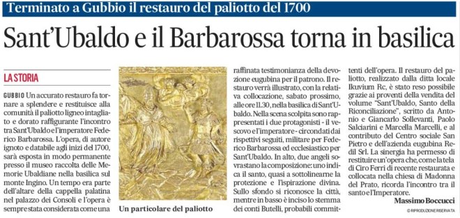 GUBBIO Un accurato restauro fa tornare a splendere e restituisce alla comunità il paliotto ligneo intagliato e dorato raffigurante l’incontro tra Sant’Ubaldo e l’imperatore Federico Barbarossa. L’opera, di autore ignoto e databile agli inizi del 1700, sarà esposta in modo permanente presso il museo raccolta delle Memorie Ubaldiane nella basilica sul monte Ingino. Un tempo era parte dell’altare della cappella palatina nel palazzo dei Consoli e l’opera è sempre stata considerata come una raffinata testimonianza della devozione eugubina per il patrono. Il restauro verrà illustrato, con la relativa collocazione, sabato prossimo, alle ore 11.30, nella basilica di Sant’Ubaldo. Nella scena scolpita sono rappresentati i due protagonisti – il vescovo e l’imperatore – circondati dai rispettivi seguiti, militare per Federico Barbarossa ed ecclesiastico per Sant’Ubaldo. In alto, due angeli sovrastano la composizione: uno indica il santo, quasi a sottolinearne la protezione e l’ispirazione divina. Sullo sfondo si riconosce la città, mentre in basso è inciso lo stemma dei conti Butelli, probabili committenti dell’opera. Il restauro del paliotto, realizzato dalla ditta locale Ikuvium Rc, è stato reso possibile grazie ai proventi della vendita del volume “Sant’Ubaldo, Santo della Riconciliazione”, scritto da Antonio e Giancarlo Sollevanti, Paolo Salciarini e Marcella Marcelli, e al contributo del Centro sociale San Pietro e dell’azienda eugubina Redil Srl. La sinergia ha permesso di restituire un’opera che, come la tela di Ciro Ferri di recente restaurata e collocata nella chiesa di Madonna del Prato, ricorda l’incontro tra il santo e l’Imperatore.