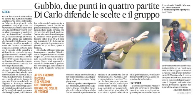 GUBBIO Il momento è molto delicato perché due punti nelle ultime quattro partite hanno fatto scattare l’allarme, dopo gli undici nelle precedenti cinque giornate con tre vittorie che restano una buona dote. La sconfitta di venerdì scorso ad Arezzo, contro la lanciatissima capolista dell’ex Cristian Bucchi, ha confermato gli imbarazzi di queste ultime due settimane che hanno frenato la corsa rossoblù, con una classifica meno luccicante e la Ternana che ha fatto il sorpasso. Mimmo Di Carlo tiene su il morale della squadra e dell’ambiente, riprendendo oggi gli allenamenti in vista dell’impegno di sabato prossimo al Barbetti (ore 17.30) contro il neopromosso Guidonia Montecelio, tornato al successo in casa contro la Pianese dopo due sconfitte.