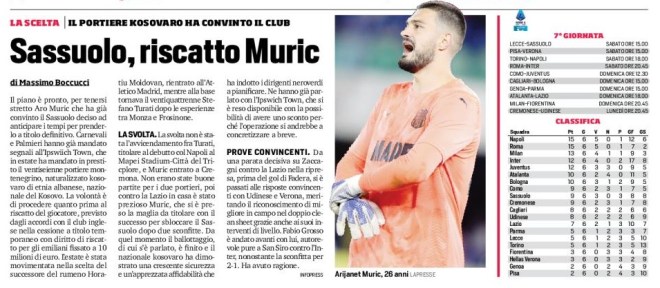 Il piano è pronto, per tenersi stretto Aro Muric che ha già convinto il Sassuolo deciso ad anticipare i tempi per prenderlo a titolo definitivo. Carnevali e Palmieri hanno già mandato segnali all’Ipswiich Town, che in estate ha mandato in prestito il ventiseienne portiere montenegrino, naturalizzato kosovaro di etnia albanese, nazionale del Kosovo. La volontà è di procedere quanto prima al riscatto del giocatore, previsto dagli accordi con il club inglese nella cessione a titolo temporaneo con diritto di riscatto per gli emiliani fissato a 10 milioni di euro. L’estate è stata movimentata nella scelta del successore del rumeno Horatiu Moldovan, rientrato all’Atletico Madrid, mentre alla base tornava il ventiquattrenne Stefano Turati dopo le esperienze tra Monza e Frosinone.