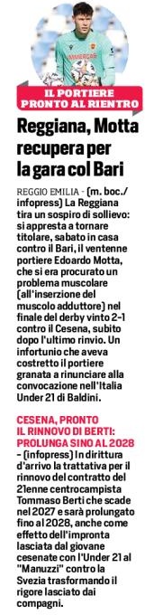 CESENA, PRONTO IL RINNOVO DI BERTI: PROLUNGA SINO AL 2028 – (infopress) In dirittura d’arrivo la trattativa per il rinnovo del contratto del 21enne centrocampista Tommaso Berti che scade nel 2027 e sarà prolungato fino al 2028, anche come effetto dell’impronta lasciata dal giovane cesenate con l’Under 21 al “Manuzzi” contro la Svezia trasformando il rigore lasciato dai compagni.