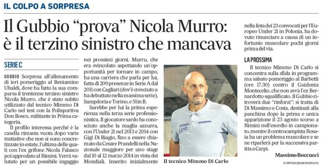 GUBBIO Sorpresa all’allenamento di ieri pomeriggio al Beniamino Ubaldi, dove ha fatto la sua comparsa il trentenne terzino sinistro Nicola Murro, che è stato subito utilizzato dal tecnico Mimmo Di Carlo nel test con la Polisportiva Don Bosco, militante in Prima categoria.