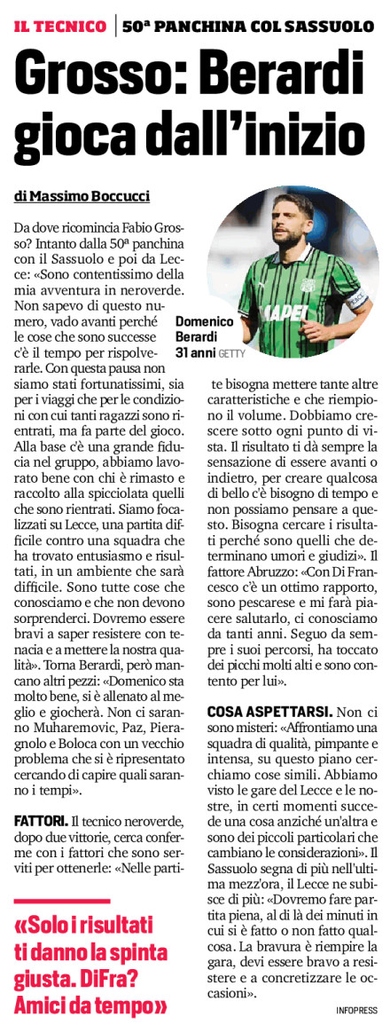 Da dove ricomincia Fabio Grosso? Intanto dalla 50ª panchina con il Sassuolo e poi da Lecce: «Sono contentissimo della mia avventura in neroverde. Non sapevo di questo numero, vado avanti perché le cose che sono successe c’è il tempo per rispolverarle. Con questa pausa non siamo stati fortunatissimi, sia per i viaggi che per le condizioni con cui tanti ragazzi sono rientrati, ma fa parte del gioco. Alla base c’è una grande fiducia nel gruppo, abbiamo lavorato bene con chi è rimasto e raccolto alla spicciolata quelli che sono rientrati. Siamo focalizzati su Lecce, una partita difficile contro una squadra che ha trovato entusiasmo e risultati, in un ambiente che sarà difficile. Sono tutte cose che conosciamo e che non devono sorprenderci. Dovremo essere bravi a saper resistere con tenacia e a mettere la nostra qualità». Torna Berardi, però mancano altri pezzi: «Domenico sta molto bene, si è allenato al meglio e giocherà. Non ci saranno Muharemovic, Paz, Pieragnolo e Boloca con un vecchio problema che si è ripresentato cercando di capire quali saranno i tempi».