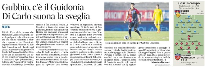 GUBBIO L’ora della scossa che Mimmo Di Carlo cerca a tutti i costi dopo 2 punti nelle ultime 4 partite che hanno rallentato la marcia e spento un po’ l’ambiente aspettando una reazione. Al Barbetti l’occasione del rilancio oggi (ore 17.30) contro il neopromosso Guidonia Montecelio di Ciro Ginestra e dell’ex Bernardotto che però non ci sarà per squalifica dopo 9 presenze e 3 gol (più un assist), l’ultimo alla Pianese all’82’ per tornare alla vittoria dopo 2 sconfitte esterne di fila. Il tecnico ritrova Di Massimo e Costa che vanno in panchina, mentre non dispone di Rosaia per problemi muscolari (atteso il ritorno la prossima a Carpi). In tribuna ci sarà Murru, il terzino sinistro dai trascorsi in A e B (ex Cagliari, Sampdoria e Torino) che potrebbe essere tesserato nei prossimi giorni.