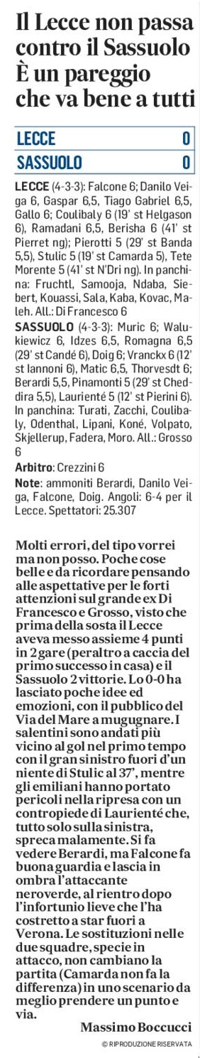 Molti errori, del tipo vorrei ma non posso. Poche cose belle e da ricordare pensando alle aspettative per le forti attenzioni sul grande ex Di Francesco e Grosso, visto che prima della sosta il Lecce aveva messo assieme 4 punti in 2 gare (peraltro a caccia del primo successo in casa) e il Sassuolo 2 vittorie. Lo 0-0 ha lasciato poche idee ed emozioni, con il pubblico del Via del Mare a mugugnare. I salentini sono andati più vicino al gol nel primo tempo con il gran sinistro fuori d’un niente di Stulic al 37’, mentre gli emiliani hanno portato pericoli nella ripresa con un contropiede di Laurienté che, tutto solo sulla sinistra, spreca malamente. Si fa vedere Berardi, ma Falcone fa buona guardia e lascia in ombra l’attaccante neroverde, al rientro dopo l’infortunio lieve che l’ha costretto a star fuori a Verona. Le sostituzioni nelle due squadre, specie in attacco, non cambiano la partita (Camarda non fa la differenza) in uno scenario da meglio prendere un punto e via.