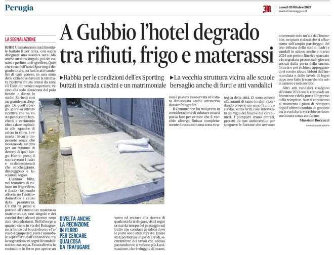 GUBBIO Un materasso matrimoniale buttato lì per terra, con sopra disegnata una svastica nera. Ma anche un altro singolo, poi dei cuscini e perfino un frigorifero. Quel che resta dell’hotel Sporting è degrado totale, tra furti e atti vandalici di ogni genere, in una zona della città dove davanti la struttura ricettiva chiusa ormai da anni c’è l’istituto tecnico superiore, vicino alla sede distaccata del polo liceale, e dietro lo stadio Barbetti con un grande parcheggio. Di quell’albergo, gloriosa attività ricettiva che ha visto per decenni banchetti e cerimonie oltre a dare ospitalità alle squadre di calcio in ritiro, è rimasta l’incuria imperante senza che nessuno alzi un dito per un minimo di decoro di quel luogo. Hanno preso il sopravvento i ladri e malintenzionati che saccheggiano, distruggono e lasciano il segno.