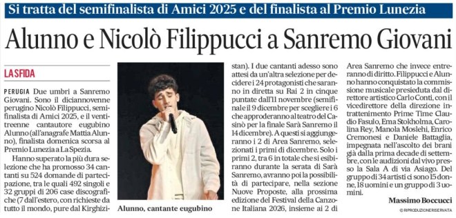 PERUGIA Due umbri a Sanremo Giovani. Sono il diciannovenne perugino Nicolò Filippucci, semifinalista di Amici 2025, e il ventitreenne cantautore eugubino Alunno (all’anagrafe Mattia Alunno), finalista domenica scorsa al Premio Lunezia a La Spezia.