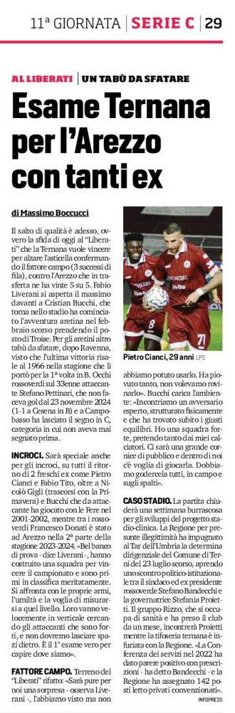 Il salto di qualità è adesso, ovvero la sfida di oggi al “Liberati” che la Ternana vuole vincere per alzare l’asticella confermando il fattore campo (3 successi di fila), contro l’Arezzo che in trasferta ne ha vinte 5 su 5. Fabio Liverani si aspetta il massimo davanti a Cristian Bucchi, che torna nello stadio ha cominciato l’avventura aretina nel febbraio scorso prendendo il posto di Troise. Per gli aretini altro tabù da sfatare, dopo Ravenna, visto che l’ultima vittoria risale al 1966 nella stagione che li portò per la 1ª volta in B. Occhi rossoverdi sul 33enne attaccante Stefano Pettinari, che non faceva gol dal 23 novembre 2024 (1-1 a Cesena in B) e a Campobasso ha lasciato il segno in C, categoria in cui non aveva mai segnato prima.
