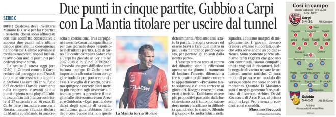 GUBBIO Qualcosa deve inventarsi Mimmo Di Carlo per far ripartire i rossoblù che si sono afflosciati con due sconfitte consecutive e appena due punti nelle ultime cinque giornate. Le conseguenze hanno visto il Gubbio scivolare al tredicesimo posto, dopo il brillante avvio con undici punti nei precedenti cinque turni.