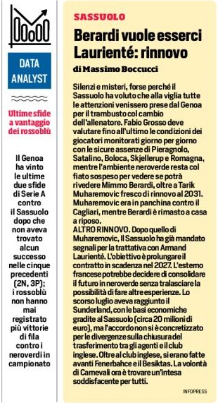 Silenzi e misteri, forse perché il Sassuolo ha voluto che alla viglia tutte le attenzioni venissero prese dal Genoa per il trambusto col cambio dell’allenatore. Fabio Grosso deve valutare fino all’ultimo le condizioni dei giocatori monitorati giorno per giorno con le sicure assenze di Pieragnolo, Satalino, Boloca, Skjellerup e Romagna, mentre l’ambiente neroverde resta col fiato sospeso per vedere se potrà rivedere Mimmo Berardi, oltre a Tarik Muharemovic fresco di rinnovo al 2031. Muharemovic era in panchina contro il Cagliari, mentre Berardi è rimasto a casa a riposo.