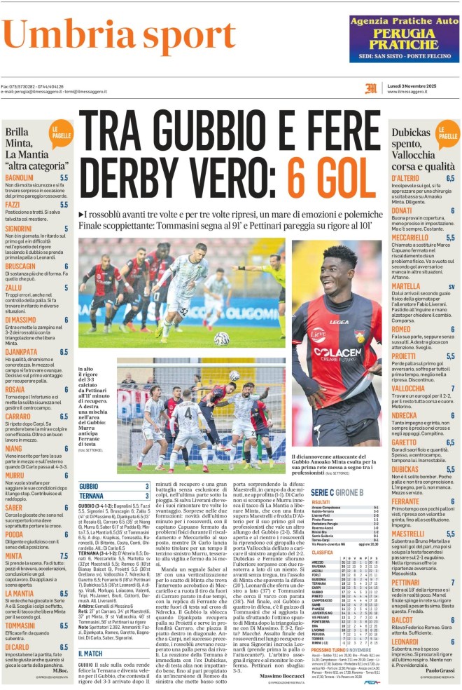 GUBBIO Il sale sulla coda rende felice la Ternana e diventa veleno per il Gubbio, che contesta il rigore del 3-3 arrivato dopo 11 minuti di recupero e una gran battaglia senza esclusione di colpi, nell’ultima parte sotto la pioggia. Si salva Liverani che vede i suoi rimontare tre volte lo svantaggio. Sorprese nelle due formazioni: novità dell’ultimo minuto per i rossoverdi, con il capitano Capuano fermato da problemi fisici durante il riscaldamento e Meccariello al suo posto, mentre Di Carlo lancia subito titolare per un tempo il terzino sinistro Murru, tesserato alla vigilia e fermo da 14 mesi. Manda un segnale Saber al 18’ con una verticalizzazione per lo scatto di Minta che trova l’intervento acrobatico di Meccariello, e a ruota il tiro da fuori di Carraro parato in due tempi, con la replica di Ferrante che mette fuori di testa sul cross di Ndrecka. Il Gubbio la sblocca quando Djankpata recupera palla su Proietti e serve in profondità Carraro, che piazza il piatto destro in diagonale. Anche a Carpi, nel successo precedente, i rossoblù avevano recuperato una palla persa dai rivali. La reazione della Ternana è immediata con l’ex Dubickas, che di testa alza non impattando bene, fino al pari propiziato da un’incursione di Romeo da sinistra che mette basso sotto porta sorprendendo la difesa: Maestrelli, in campo da due minuti, ne approfitta. Di Carlo non si scompone e Murru innesca il tacco di La Mantia a liberare Minta, che con una finta supera Maestrelli e fredda D’Alterio per il suo primo gol nei professionisti. Sfida aperta e al rientro i rossoverdi la riprendono col giropalla che porta Vallocchia defilato a caricare il sinistro angolato del 2-2. Dubickas e Ferrante sfiorano il sorpasso con due rasoterra a lato d’un niente. Si avanti senza tregua, tra l’assolo di Minta che spaventa la difesa (20’), Leonardi che sferra un destro a lato (37’) e Tommasini che cerca il varco con parata (38’). Nel finale, col Gubbio a quattro in difesa, c’è il guizzo di Tommasini che si aggiusta la palla sfruttando l’ottimo spunto di Minta dopo la triangolazione con Di Massimo. Finita? Macché. Assalto finale dei rossoverdi nel lungo recupero e in area Signorini incrocia Leonardi (prende prima la palla o l’attaccante?). L’arbitro assegna il rigore e al monitor lo conferma. Pettinari non sbaglia.