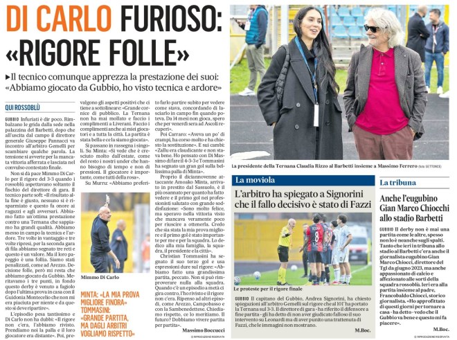 Non si dà pace Mimmo Di Carlo per il rigore del 3-3 quando i rossoblù aspettavano soltanto il fischio del direttore di gara. Il tecnico parte soft: «Il risultato alla fine è giusto, nessuno si è risparmiato e questo fa onore ai ragazzi e agli avversari. Abbiamo fatto un’ottima prestazione contro una Ternana che sappiamo ha grandi qualità. Abbiamo messo in campo la tecnica e l’ardore. Tre volte in vantaggio e tre volte ripresi, per la seconda gara di fila abbiamo segnato tre reti e questo è un valore. Ma il loro pareggio è una follia. Siamo stati penalizzati, come ad Arezzo. Decisione folle, però mi resta che abbiamo giocato da Gubbio. Meritavamo i tre punti, in fondo questo derby è venuto a fagiolo dopo l’ultima prova in casa con il Guidonia Montecelio che non mi era piaciuta per niente e da questo si deve ripartire».