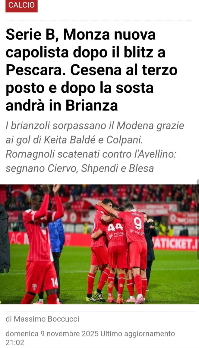 C’è una nuova capolista in Serie B: è il Monza di Paolo Bianco che a Pescara infila la 6ª vittoria consecutiva chiudendo la 12ª giornata con il sorpasso sul Modena. La sosta per le nazionali riserva ai cadetti il cambio al vertice e il Cesena ora al 3° posto dopo le 2 gare della domenica che hanno lanciato brianzoli e romagnoli. Il Monza è passato 2-0 a Pescara, inguaiando ancora di più Vincenzo Vivarini penultimo in classifica, grazie alle reti di Keita Baldé e Colpani. Vantaggio al 28’ dopo una splendida azione del Monza che si presenta in area con Ravanelli, bravo a servire Keita Baldé, il quale a porta vuota non sbaglia. All’inizio del 2° tempo arriva il raddoppio con un altro assist di Ravanelli per Colpani che dopo una bella serpentina incrocia con il sinistro. Alla ripresa del campionato ci sarà un intrigante Monza-Cesena.