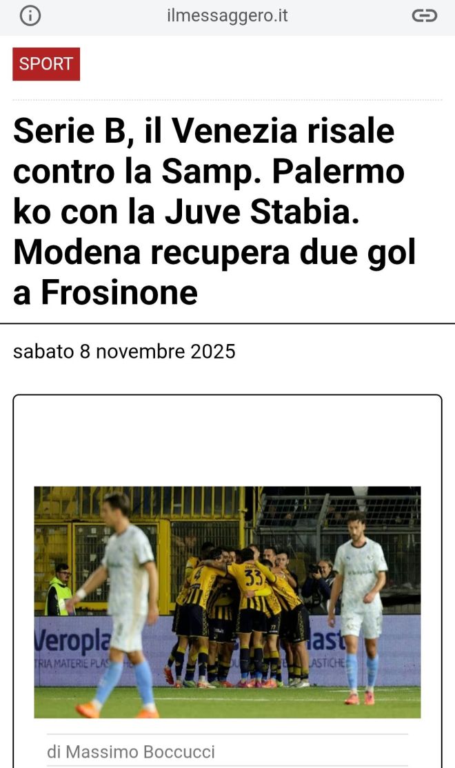 Senza esclusioni di colpi il match al Menti tra la Juve Stabia e il Palermo che, battuto 1-0, piomba nella crisi con 3 sconfitte nelle ultime 4 gare che mettono in imbarazzo Pippo Inzaghi. Campani avanti e risolutivi al 38’. Correia va in verticale sulla sinistra per il diciottenne Cacciamani, che supera la difesa grazie a uno scivolone di Pierozzi, entra in area e scarica un mancino potente sul 1° palo non lasciando scampo a Joronen. Ripresa con sussulti, al 13’ del Palermo che reclama un tocco di mano di Cacciamani al limite dell’area ma che sembra fuori per quanto il braccio sia abbastanza largo. Traversa dei padroni di casa al 38’ sul colpo di testa di Giorgini deviato dal portiere sul legno, a seguire al 90’ il 2° cartellino a Ranocchia per proteste dopo essere stato ammonito 8 minuti prima e nel recupero l’uscita efficace di Confente che respinge un pallone anticipando Le Douaron.