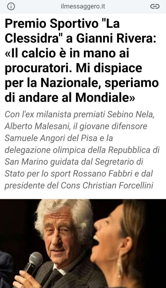 Rivera, bandiera del Milan e campione d’Europa nel 1968 con la Nazionale, ha evidenziato che «si tratta di un riconoscimento per me importante, un evento molto partecipato. La serata mi ha piacevolmente sorpreso andando ben oltre le mie aspettative. Il calcio è in mano ai procuratori, qualcosa non torna. Mi dispiace per la Nazionale, speriamo di andare al Mondiale perché le ultime due esclusioni hanno fatto male».