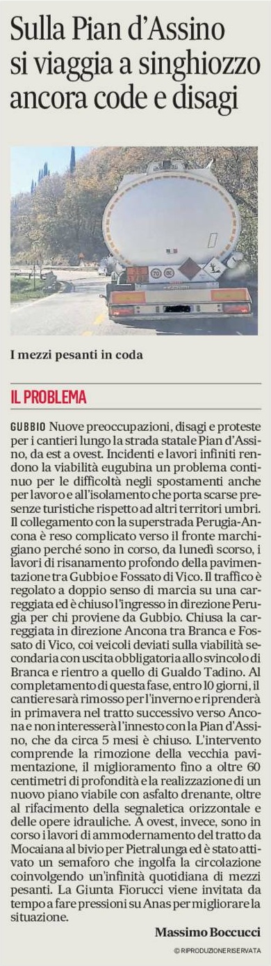 GUBBIO Nuove preoccupazioni, disagi e proteste per i cantieri lungo la strada statale Pian d’Assino, da est a ovest. Incidenti e lavori infiniti rendono la viabilità eugubina un problema continuo per le difficoltà negli spostamenti anche per lavoro e all’isolamento che porta scarse presenze turistiche rispetto ad altri territori umbri. Il collegamento con la superstrada Perugia-Ancona è reso complicato verso il fronte marchigiano perché sono in corso, da lunedì scorso, i lavori di risanamento profondo della pavimentazione tra Gubbio e Fossato di Vico. Il traffico è regolato a doppio senso di marcia su una carreggiata ed è chiuso l’ingresso in direzione Perugia per chi proviene da Gubbio. Chiusa la carreggiata in direzione Ancona tra Branca e Fossato di Vico, coi veicoli deviati sulla viabilità secondaria con uscita obbligatoria allo svincolo di Branca e rientro a quello di Gualdo Tadino. Al completamento di questa fase, entro 10 giorni, il cantiere sarà rimosso per l’inverno e riprenderà in primavera nel tratto successivo verso Ancona e non interesserà l’innesto con la Pian d’Assino, che da circa 5 mesi è chiuso. L’intervento comprende la rimozione della vecchia pavimentazione, il miglioramento fino a oltre 60 centimetri di profondità e la realizzazione di un nuovo piano viabile con asfalto drenante, oltre al rifacimento della segnaletica orizzontale e delle opere idrauliche. A ovest, invece, sono in corso i lavori di ammodernamento del tratto da Mocaiana al bivio per Pietralunga ed è stato attivato un semaforo che ingolfa la circolazione coinvolgendo un’infinità quotidiana di mezzi pesanti. La Giunta Fiorucci viene invitata da tempo a fare pressioni su Anas per migliorare la situazione.