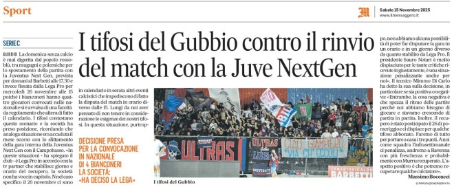 GUBBIO La domenica senza calcio è mal digerita dal popolo rossoblù, tra mugugni e polemiche per lo spostamento della partita con la Juventus Next Gen, prevista per domani al Barbetti alle 17.30 e invece fissata dalla Lega Pro per mercoledì 26 novembre alle 15 poiché i bianconeri hanno quattro giocatori convocati nelle nazionali e si è avvalsa di una facoltà da regolamento che altera di fatto il calendario. I tifosi contestano questo scenario e la società ha preso posizione, ricordando che analoga situazione era accaduta il mese scorso con lo slittamento della gara interna della Juventus Next Gen con il Campobasso. «In queste situazioni – ha spiegato il club – è Lega Pro in accordo con la tv partner che stabilisce giorno e orario del recupero, la società non ha voce in capitolo. N nel caso specifico il 26 novembre ci sono in calendario in serata altri eventi calcistici che impediscono di fatto la disputa del match in orario diverso dalle 15. Lungi da noi aver pensato di non tenere in considerazione le esigenze dei nostri tifosi. In questa situazione, purtroppo, non abbiamo alcuna possibilità di poter far disputare la gara in un orario e in un giorno diverso da quanto stabilito da Lega Pro. Il presidente Sauro Notari è molto dispiaciuto per le tante critiche ricevute ingiustamente, è una situazione penalizzante anche per noi». Il tecnico Mimmo Di Carlo ha detto la sua sulla decisione, in particolare se sia positiva o negativa: «Entrambe, la cosa negativa è che spezza il ritmo delle partite perché noi abbiamo bisogno di giocare e stavamo crescendo di partita in partita. Inoltre, il recupero è stato posticipato il 26 di pomeriggio e ci dispiace per qualche tifoso abbonato. Faremo di tutto per portare a casa i tre punti. A noi come squadra l’infrasettimanale ci penalizza, andremo a Ravenna con più freschezza e probabilmente con Murru recuperato. L’aspetto positivo è che potremo recuperare qualche calciatore».