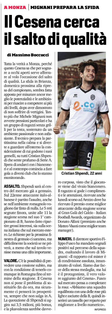 Tutta la verità a Monza, perché questo Cesena sa che per sognare a occhi aperti serve afferrare al volo l’occasione del salto di qualità. La sfida in Brianza, domenica prossima alla ripresa del campionato, sembra fatta apposta per misurare ancor meglio le potenzialità e le ambizioni per riuscire a competere ai più alti livelli, dopo aver dimostrato di non soffrire di vertigini. Tanto più che Michele Mignani non avverte pressioni particolari e ha un gruppo di ragazzi senza grilli per la testa, sostenuto da un ambiente passionale e non asfissiante. Il tecnico prepara la partitissima nella calma e si diverte a guardare all’esterno la considerazione di cui godono i suoi gemelli, su tutti Cristian Shpendi che sente profumo di Serie A. Spera di andarci con i bianconeri e al contempo comincia a fare gola a diversi club che lo stanno monitorando.