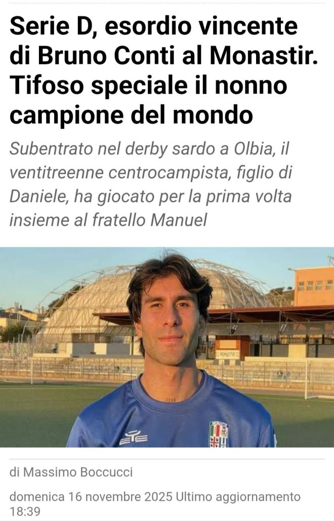 Bruno e Daniele Conti, padre e figlio, supertifosi d’eccezione in una domenica speciale, perché in campo Manuel e l’altro Bruno, nipote del campione del mondo di Spagna ’82, insieme non avevano mai giocato. È successo oggi pomeriggio (domenica 16 novembre) nel derby sardo Olbia-Monastir, valevole per 12ª giornata in Serie D, girone G, con la vittoria in trasferta al Nespoli per 2-1 dei fratelli Conti, con il ventitreenne Bruno che è subentrato e ha esordito nel migliore dei modi visto che la sua squadra, con questo successo, ha agganciato proprio i rivali a quota 17 punti in classifica, a -4 dalla zona playoff.