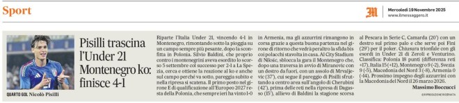Riparte l’Italia Under 21, vincendo 4-1 in Montenegro, rimontando sotto la pioggia su un campo sempre più pesante, dopo la sconfitta in Polonia. Silvio Baldini, che proprio contro i montenegrini aveva esordito lo scorso 5 settembre col successo per 2-1 a La Spezia, cerca e ottiene la reazione al ko e anche sul campo perché va sotto, pareggia subito e nella ripresa si scatena. Il primo posto nel girone E di qualificazione all’Europeo 2027 resta della Polonia, che sempre ieri ha vinto 1-0 in Armenia, ma gli azzurrini restano in corsa grazie a questa buona partenza nel girone di ritorno che vedrà peraltro la sfida bis coi polacchi stavolta in casa. Al City Stadium di Niksic, sblocca la gara il Montenegro che, dopo una traversa in avvio di Miranovic con un destro da fuori, con un assolo di Mrvaljevic (37’), cui segue il pareggio di Pisilli sfruttando a centro area sull’angolo di Cherubini (42’), prima delle reti nella ripresa di Dagasso (15’), allievo di Baldini la stagione scorsa al Pescara in Serie C (scambia Cherubini e scavalca Radanovic), Camarda (20’) con un destro sul primo palo e che serve poi Fini (29’) per il poker. Chiusura trionfale con gli esordi in Under 21 di Kevin Zeroli e Lorenzo Venturino. Classifica: Polonia 18 punti (differenza reti +17), Italia 15 (+12), Montenegro 9 (-2), Svezia 9 (-5), Macedonia del Nord 3 (-8), Armenia 0 (-14). Prossimo impegno degli azzurrini con la Macedonia del Nord il 26 marzo 2026.