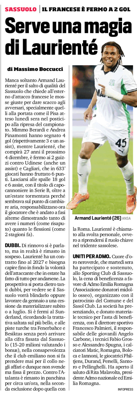 DUBBI. Di rinnovo si è parlato, ma in realtà è rimasto in sospeso. Laurienté ha un contratto fino al 2027 e bisogna capire fino in fondo la volontà dell’attaccante che in estate ha fatto di tutto per andarsene. La prospettiva si porta dietro tanti dubbi, per vedere se il Sassuolo vorrà blindarlo oppure lavorare da gennaio a una cessione da materializzare subito o a luglio. Si è fermi al Sunderland, ricordando la trattativa saltata sul più bello, e alle piste turche tra Fenerbahce e Besiktas senza però arrivare alla cifra fissata dal Sassuolo (15-20 milioni valutando i bonus), nella consapevolezza che il club emiliano non si fa prendere mai per il collo negli affari e dunque non svende ma fissa il prezzo. Contro l’Atalanta è rimasto in panchina per circa un’ora, nella seconda esclusione dopo quella con la Roma. Laurienté è chiamato alla svolta personale, ovvero a riprendersi il ruolo chiave nel tridente sassolese.