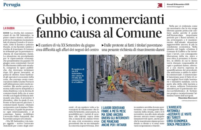 GUBBIO La rivolta dei commercianti di via XX Settembre, in pieno centro storico, nell’acropoli tra il complesso monumentale di piazza Grande e il vescovado, sotto il duomo e palazzo Ducale, si sta facendo sentire e rischia di trascinare il Comune in tribunale per la paventata richiesta di risarcimento danni. La situazione sta precipitando per le ripercussioni economiche pesantissime da quando l’11 giugno sono cominciati i lavori di rifacimento della sede stradale, comprese le opere pubbliche, che dovevano terminare dopo 105 giorni lavorativi, ai primi di ottobre. Sono furibondi gli operatori economici della zona, che avevano avuto rassicurazioni dalla Giunta Fiorucci sull’ultimazione entro metà novembre. Ma anche questa promessa sulla nuova tempistica è stata disattesa e ora la decina di commercianti della via si sono rivolti a un legale di fiducia intimando una data, il prossimo 4 dicembre, oltre la quale il confronto si farà ancora più duro. I commercianti hanno ottenuto un incontro con il sindaco Vittorio Fiorucci, il quale ha promesso ogni interessamento, e al contempo hanno mobilitato l’avvocato Fabio Antonioli, che ha inviato una pec al Comune.