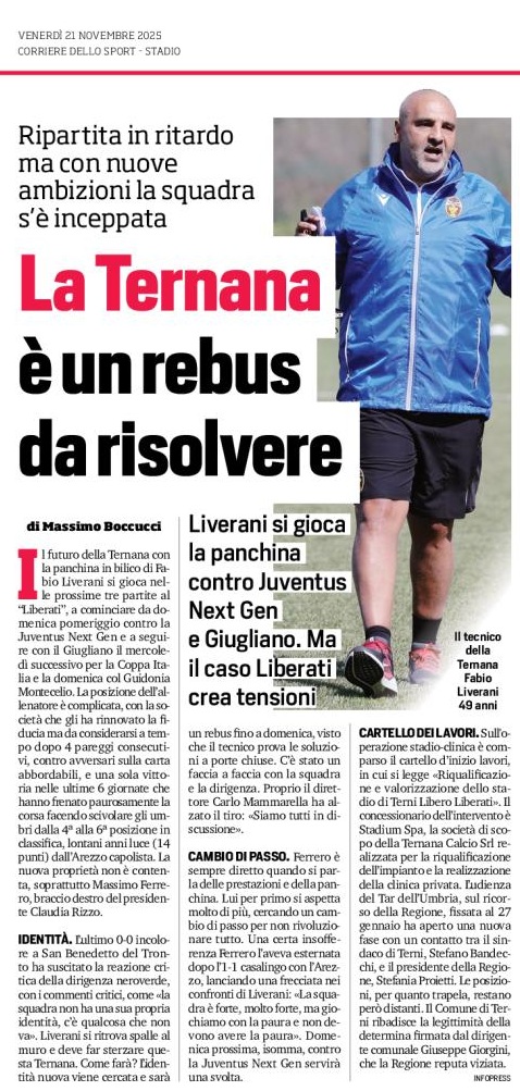Il futuro della Ternana con la panchina in bilico di Fabio Liverani si gioca nelle prossime tre partite al “Liberati”, a cominciare da domenica pomeriggio contro la Juventus Next Gen e a seguire con il Giugliano il mercoledì successivo per la Coppa Italia e la domenica col Guidonia Montecelio. La posizione dell’allenatore è complicata, con la società che gli ha rinnovato la fiducia ma da considerarsi a tempo dopo 4 pareggi consecutivi, contro avversari sulla carta abbordabili, e una sola vittoria nelle ultime 6 giornate che hanno frenato paurosamente la corsa facendo scivolare gli umbri dalla 4ª alla 6ª posizione in classifica, lontani anni luce (14 punti) dall’Arezzo capolista. La nuova proprietà non è contenta, soprattutto Massimo Ferrero, braccio destro del presidente Claudia Rizzo.